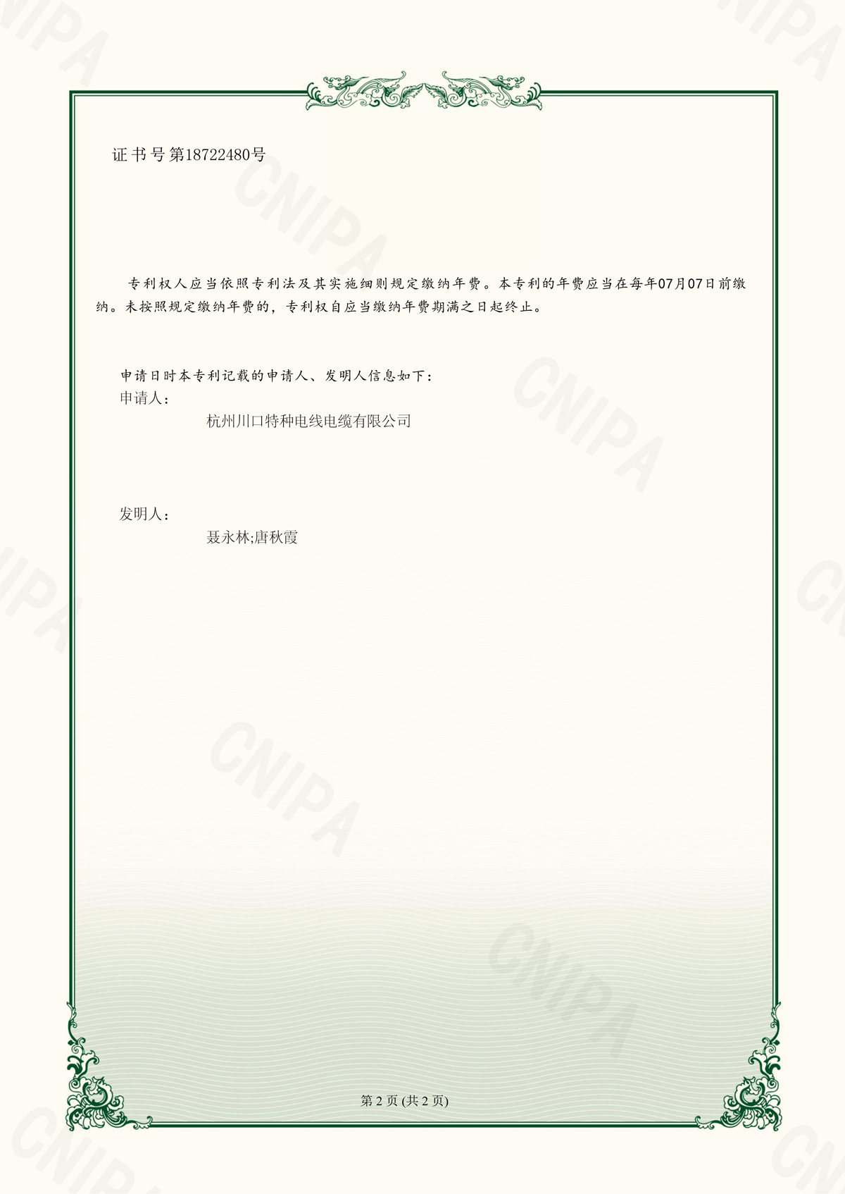 【实用新型专利证书】电镀滚筒导电线 2022217361702-1