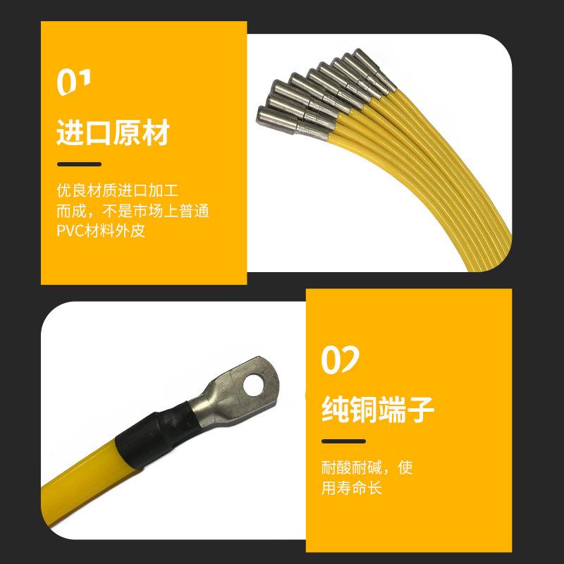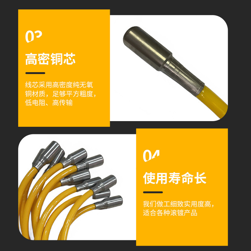 滚镀导电线特别适用于作为电镀生产线中滚筒内搭接电缆,采用高分子聚氨酯材料作为电缆护套设计,高耐磨耐酸碱腐蚀等性能优异,具备使用寿命长、耐复杂恶劣工况以及稳定耐用的基本特性,其常用规格如:1x16/1x25/1x35/1x50/1x70/1x95/1x120/1x185mm等等